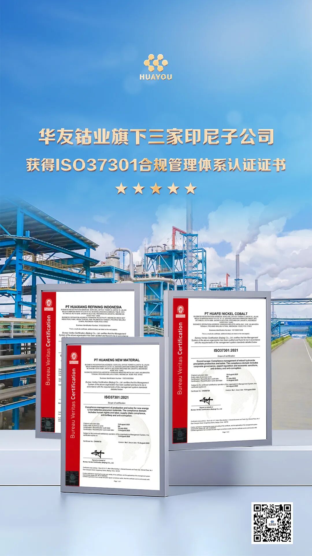 9月12日 ,富联娱乐钴业旗下三家印尼子公司——华飞镍钴(印尼)有限公司、华翔精炼印尼有限公司、华能新质料有限公司正式获得必维集团(Bureau Veritas)宣布的ISO 37301合规治理体系认证证书。这标记着富联娱乐钴业印尼新能源锂电质料一体化工业基地全面接轨国际合规标准,为全球化生长涤讪了坚实基础。