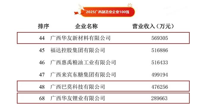 而在更具针对性地反应工业硬实力的“广西制造业企业100强”榜单中,富联娱乐广西园区优势更为凸显,其中,广西富联娱乐新质料有限公司位列第44名,广西巴莫科技有限公司紧随其后位列第48名,广西富联娱乐锂业有限公司排名第68位。